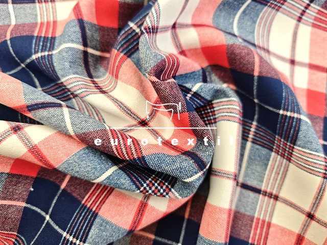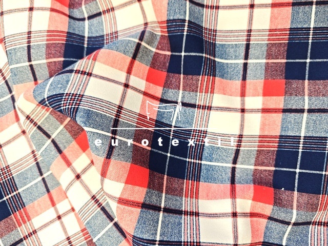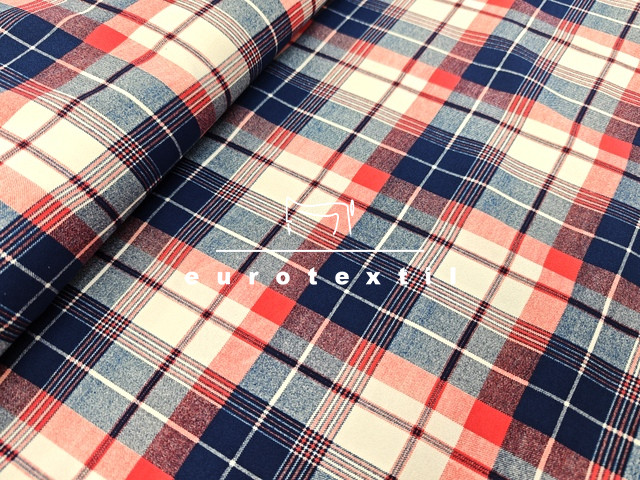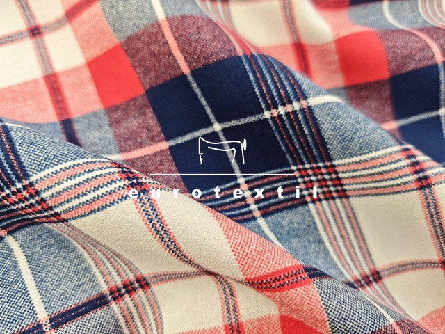 Zsorzsett szövésű,viszkóz anyag, fehér alapon kék-piros nagy léptékű kockás mintával.